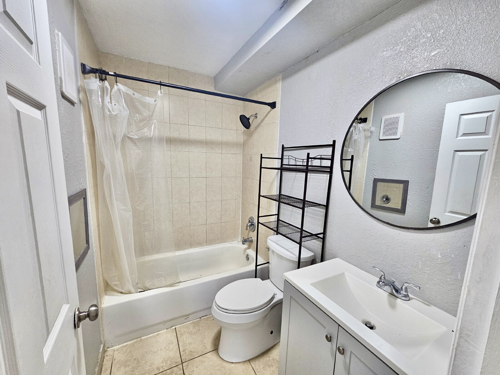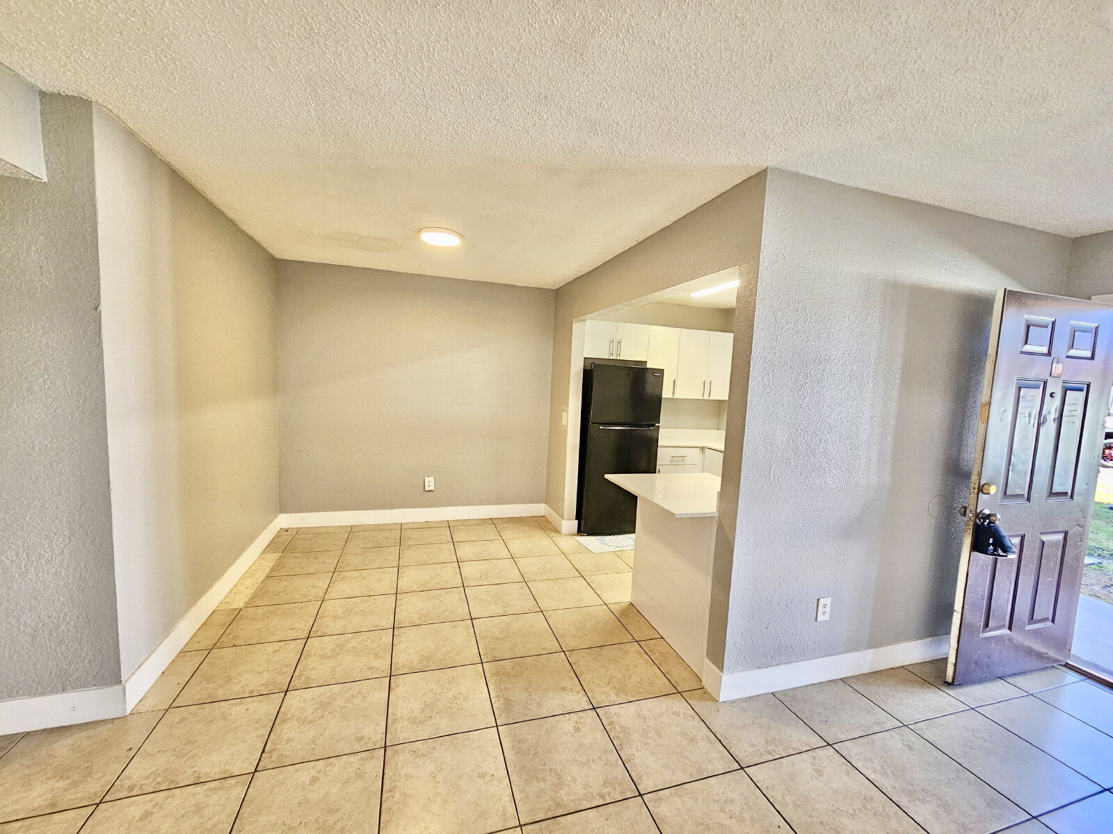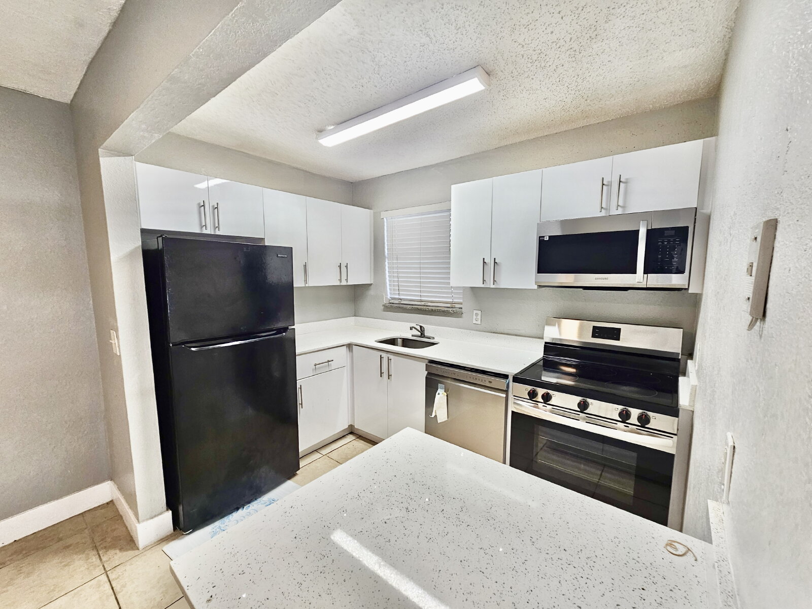 Well-maintained 2-bedroom, 1-bath apartment featuring tile flooring throughout, a bright open living area, and an updated kitchen with modern cabinetry, quartz-style countertops, and stainless steel appliances.